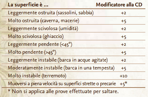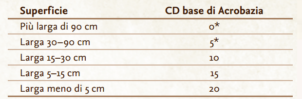 In tabella sono riportate le CD base, che sono alterate dai modificatori di Acrobazia. Con l’asterisco sono indicate le situazioni in cui non è prevista una prova a meno che i modificatori non aumentino la CD a 10 o più. Se si usa Acrobazia in questo modo, si è considerati impreparati e si perde il bonus di Destrezza alla CA.