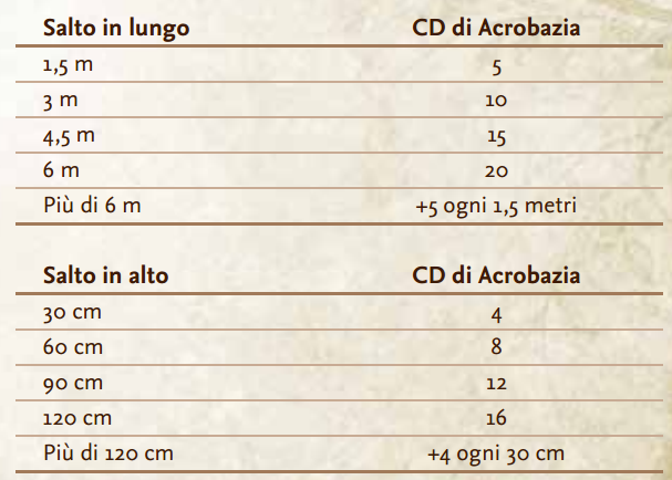 Nessun salto permette di eccedere il proprio movimento massimo per round. In caso di salto con rincorsa, il risultato della prova di Acrobazia indica la distanza percorsa nel salto. Dimezzare questo risultato per un salto da fermo in lungo per determinare la distanza alla quale si atterra.