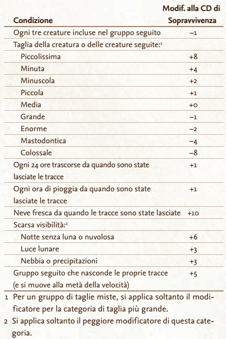 Esistono numerosi modificatori che si possono applicare alla prova di Sopravvivenza, come riportato nella tabella.