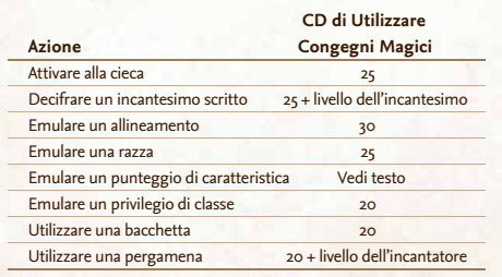 Occorre scegliere coscientemente cosa emulare: bisogna sapere cosa si sta cercando di emulare quando si effettua una prova a quel proposito. Le CD per le varie azioni che coinvolgono l’uso di Utilizzare Congegni Magici sono riassunte nella tabella seguente: