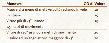 Intraprendere un’azione che viola queste regole, richiede una prova di Volare. La difficoltà di queste manovre varia in base alla manovra che si sta tentando, come indicato nella tabella seguente: