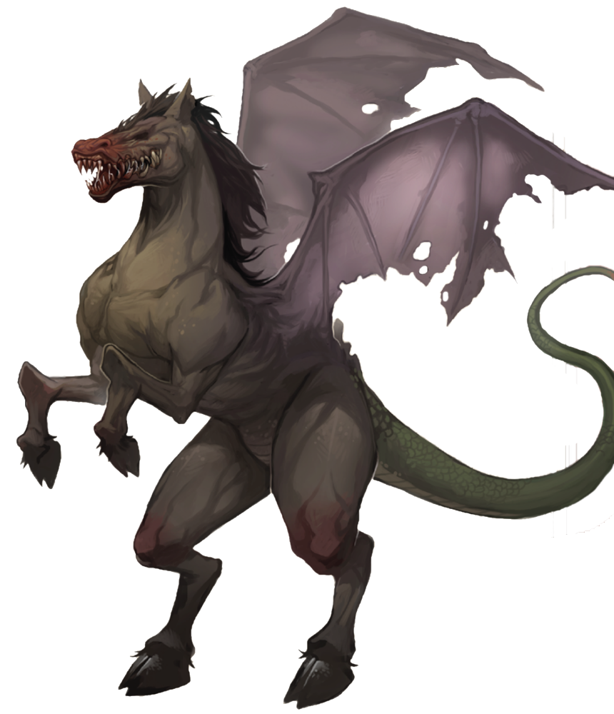 Questa logora creatura dalle sembianze di un cavallo cammina per lo più eretto. Ali, una coda da drago e una bocca piena di zanne completano il suo aspetto abietto.