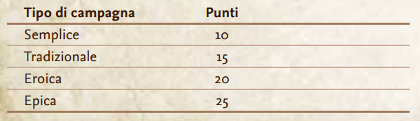 Il numero di punti che dovete spendere usando questo metodo dipende dal tipo di campagna che state giocando, come riportato in tabella, tenendo presente che i personaggi non giocanti medi (PNG) sono creati usando soltanto 3 punti.