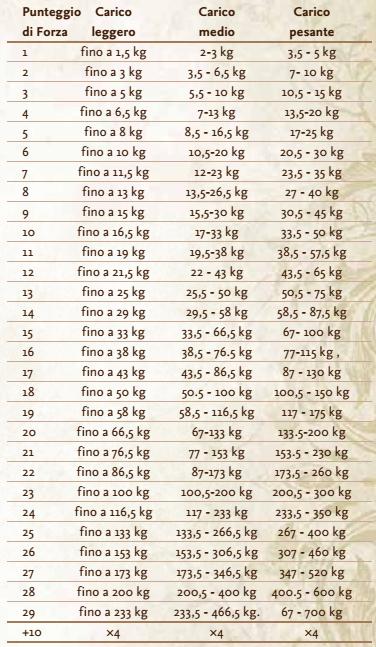 Nel caso si intenda determinare se l’attrezzatura di un personaggio sia abbastanza pesante da rallentarlo più di quanto non faccia già la sua armatura, bisogna calcolare il peso totale di armatura, armi e attrezzatura, riportati nel capitolo Equipaggiamento e confrontare nella tabella a lato questo totale con la Forza del personaggio.